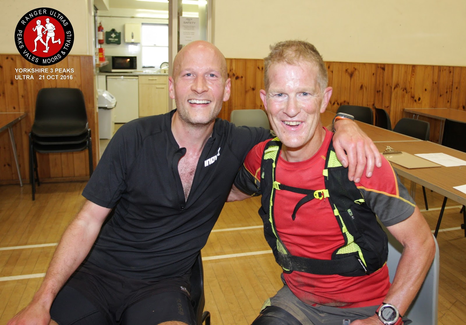 From a race director's point of view, it is always the wish for racers to be engaged in ding-dong battles all the way to the finish line. Indeed, just like what we had seen a month earlier on our Ranger Ultras, Yorkshire 3 Peaks Ultra, where Richard Lendon and Tom Hollins had pushed each other to the limit all the way up to the last 200 metres. At the final field, where there is a narrow path where to overtake would involve unsportsmanlike barging, they agreed that if they were within an few metres of each other they would rock into the finish at Hawes as joint winners. But this was no soft option joint finish. When I greeted them at the finish line they were truly a sight. Battered, bloodied and bruised, they sat down and like a double act, without pausing for breath, told me the whole story of their race. Their faces beaming with wide smiles.